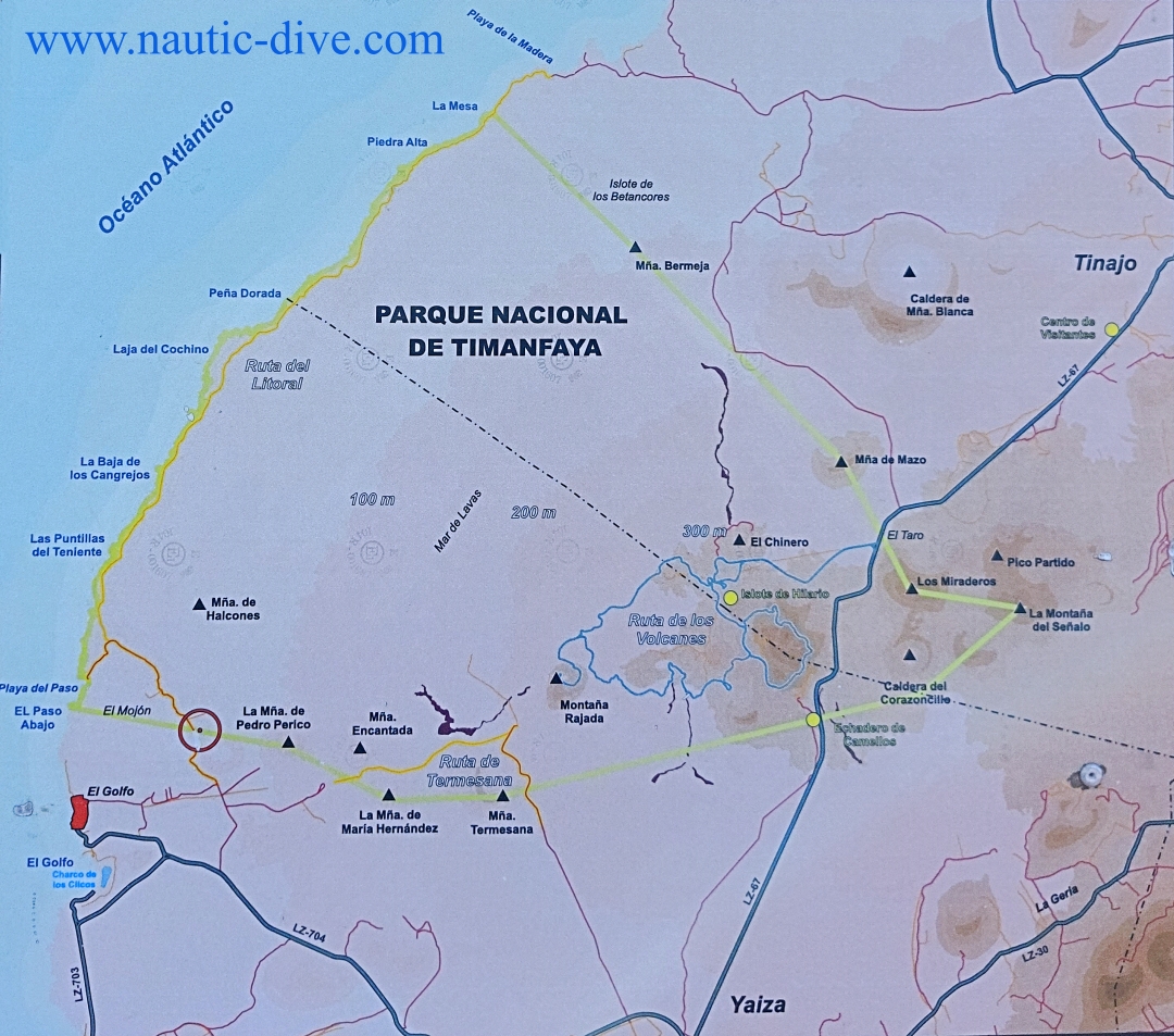 Wir gehen von El Golfo aus an der Küste des Timanfaya Nationalparks entlang. Der ehemalige kleine Fischerort ist bekannt durch die Sehenswürdigkeit „Lago Verde“ (grüner See) bekannt. Am Ortseingang von El Golfo, wo sich ebenso der Parkplatz befindet besichtigen wir am Anfang der Wanderung den „Lago Verde“. Weiter geht es durch den Fischerort mit den zahlreichen Restaurants bis zum Anfang des eigentlichen Wanderweges. Dieser Wanderweg ist nur begehbar mit festen Wanderschuhen, da dieser extrem vulkanisch und mit spitzem Lavagestein gepflastert ist. Bei bewölktem und windigem Wetter ist bitte eine lange Hose zu tragen und eine Windjacke im Rucksack mitzunehmen. Ebenso ist an ausreichend Trinkwasser und Nahrung für die Tour zu denken, da es keine Möglichkeiten zum Einkaufen gibt. Der Wanderweg ist beeindruckend, ursprünglich, naturbelassen und sehr naturnah zugleich. Der Weg führt uns am Rand des Timanfaya Nationalpark in direkter Nähe des Atlantiks entlang. Bei etwas windigem Wetter steigt das Meerwasser die Klippen hinauf und sieht ständig die Uhrgewalt des Meeres. Diese Felsküste ist durch die letzten großen Vulkan - Eruptionen im Jahr 1730 bis 1736 entstanden. Höhlen, Grotten bizarre Felsformationen sind in alle Richtungen zu sehen. Ebenso gibt es entlang des Wanderweges einige Naturstrände, wie zum Beispiel „Playa El Paso“. Diese Strände sind zum Baden gehen mit Vorsicht zu genießen, da es hier sehr wellig sein kann und Strömungen vorherrschen. Für schöne Fotos und eine kleine Pause ist dieser Strand immer ein guter Platz. Wenn wir ca. 1 km nach dem Strandbesuch an der nächsten Gabelung in Richtung Osten gehen, dann führt uns ein Rundkurs durch das Vulkangebiet nach 8 Kilometer zurück nach „El Golfo“ zum Ausgangspunkt nach ca. 3,5 Stunden zurück. Sollten Wanderfreunde den Weg an der Küste zu den nächsten Naturstränden folgen, dann besteht die Möglichkeit eine 15 Kilometer lange Tour zu unternehmen. Für extrem begeisterte Wanderer geht dieser Wanderweg bis zum „Playa de la Madera“ am Rand des Timanfaya Nationalparks und gehen von diesem Punkt im Rundkurs zurück nach el Golfo. Mit einer Länge von über 30 km ist dieser lange Weg eine Herausforderung und sollte ca.8 Stunden einplanen.